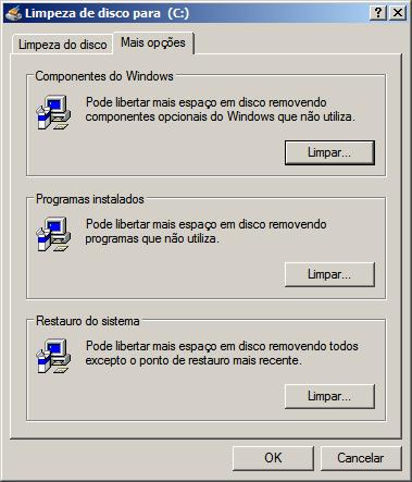 5º Passo; Nesta janela, na pasta Limpeza do disco, colocamos um visto em todas as opções. 6º Passo; Nesta mesma janela activamos a pasta Mais opções